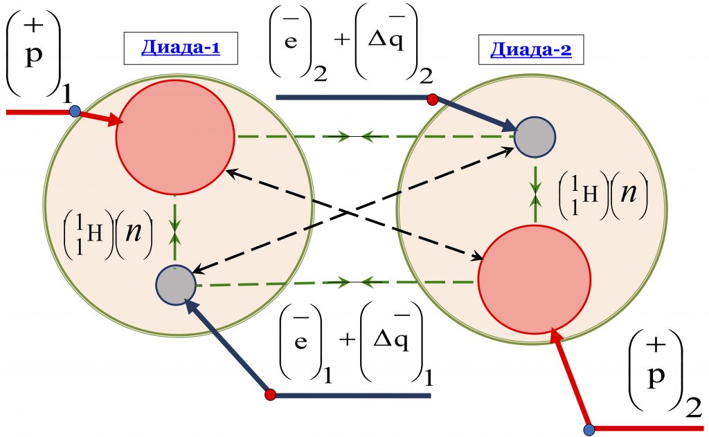 Отнимем линейную скорость протона от скорости движения электрона и получим значение Δ скорости, которое соответствует возбуждению \Delta\left(\overset{-}{q}\right) в диаде и при этом значение \overset{+}{\gamma} приравняем к 1: