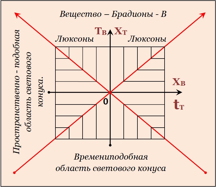 домены вещества и антивещества абсолютно равноправны и «свободно плавают» во всём мировом пространстве — АФВ и разделены между собой световым конусом (рис.1) т.е., находятся в состоянии суперпозиции. Т.к. брадионы, в собственной системе отсчёта, при отсутствии внешней силы, обладают энергией покоя: